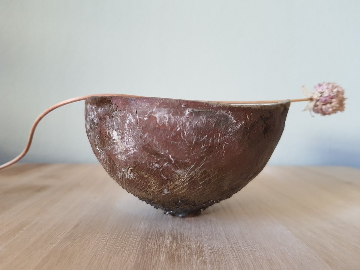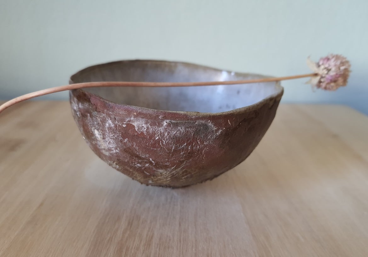 Ciotola foggiata a mano con la tecnica del pizzicato. Smalto bianco satin all'interno e superficie con finitura irregolare all'esterno.