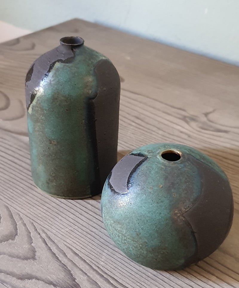 Piccoli vasi monofiore in grès puntinato della famiglia cromatica Verde Rame (matt). Serie Minima Argillaria. Confezione in scatolina di cartone con logo del prodotto.
