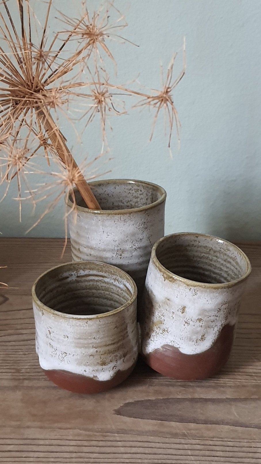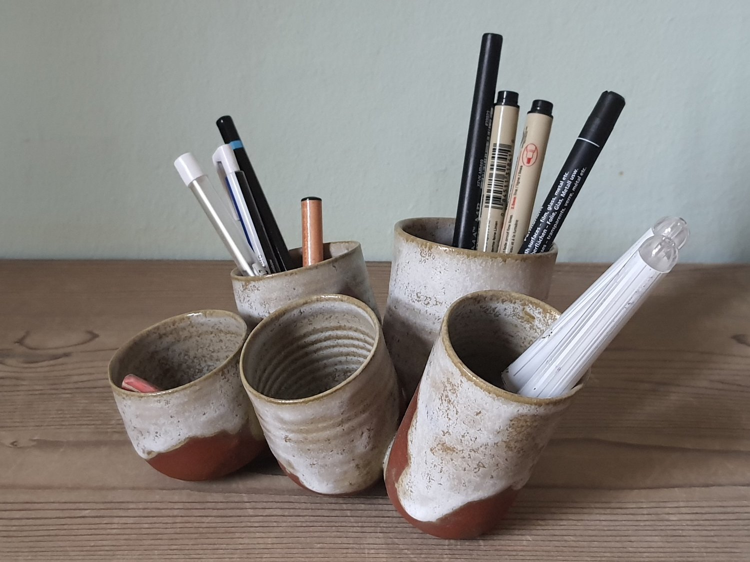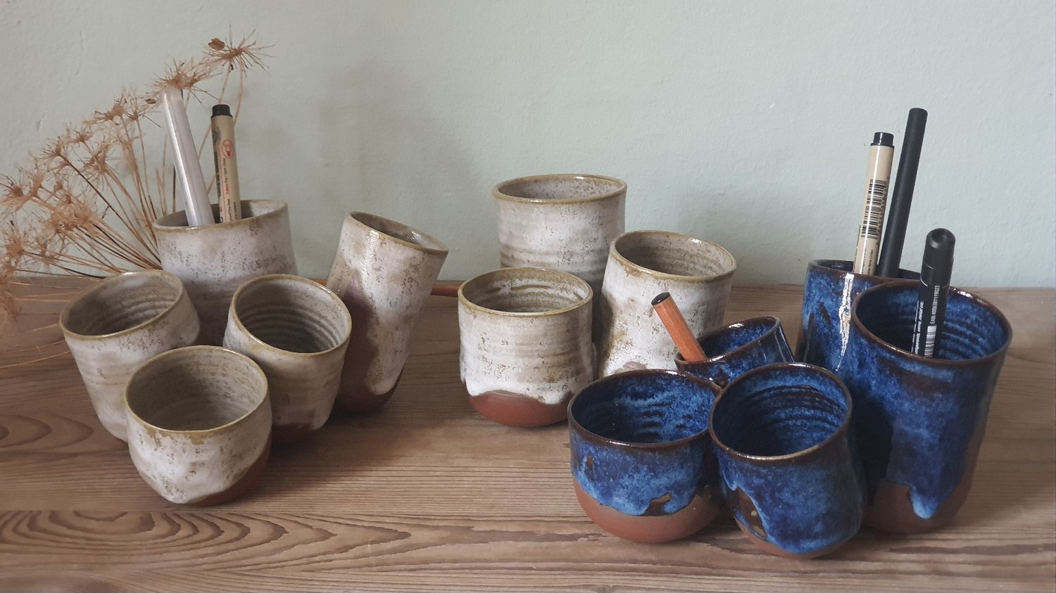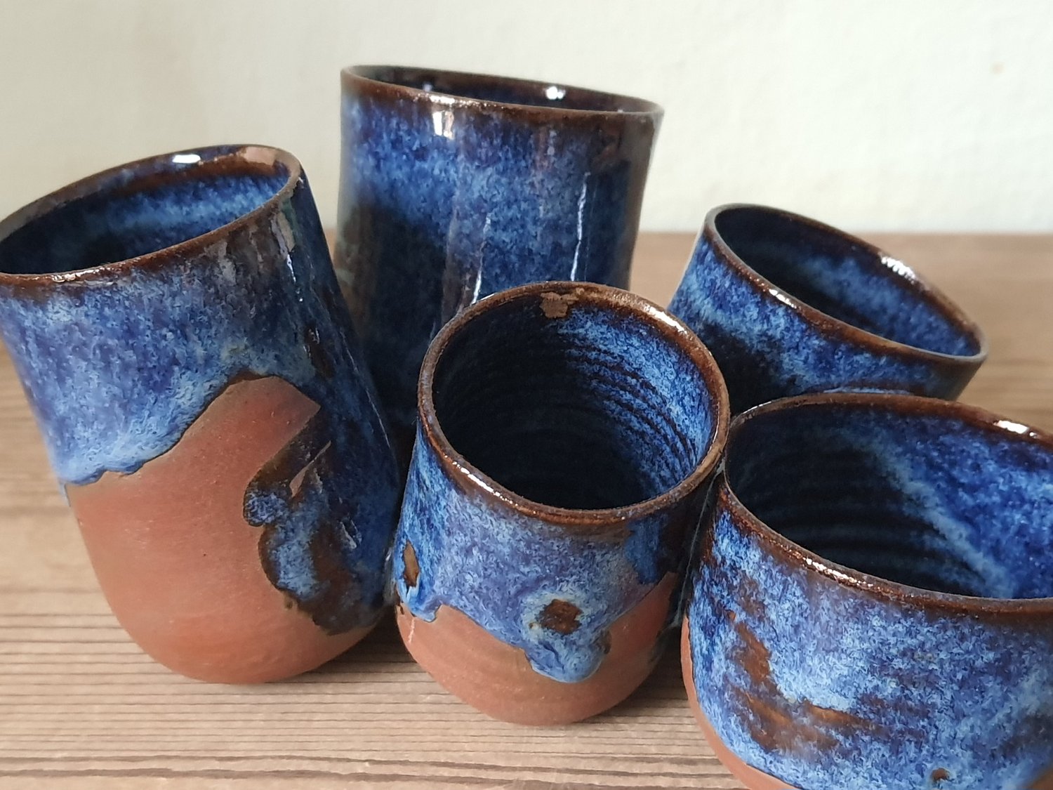 Forme lavorate a tornio, rifinite e saldate. Grès rosso. Cottura 1200° C. Colori Blu e Bianco satin.