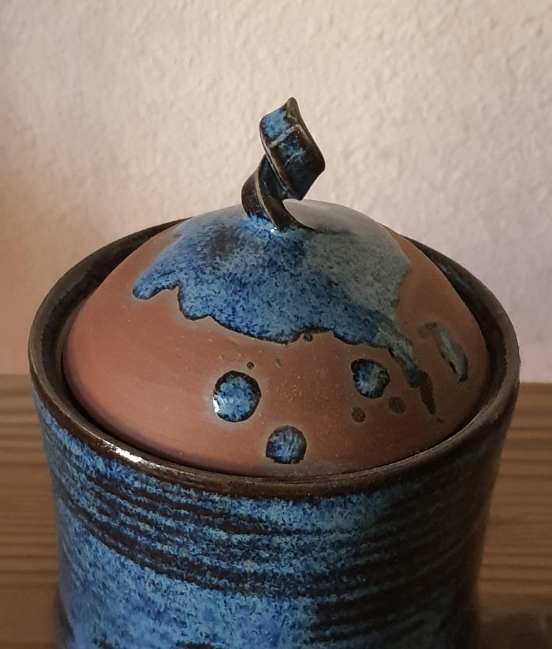 Tazzina da caffè e zuccheriera in grès rosso e smalto blu lucido. Linea Deep-in-Blue.